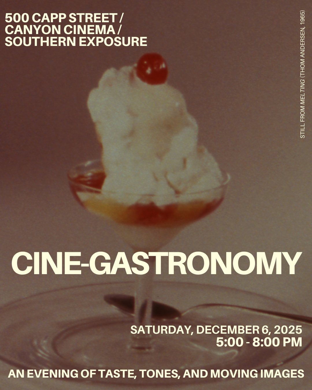 Join us for Cine-Gastronomy, a sensorial evening hosted by 500 Capp Street, Southern Exposure and Canyon Cinema. Featuring a live performance by Roco Córdova, an assortment of delectable films from Canyon’s collection, and artist-designed small bites and drinks. Read More