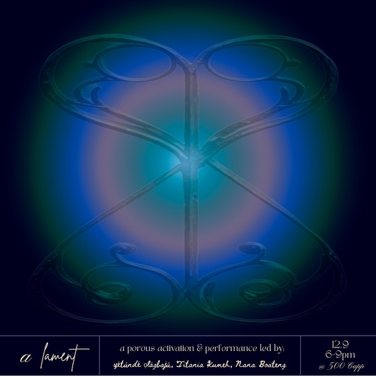 In collaboration with San Francisco Arts Commission and their Shaping Legacy: Monuments and Memorials project, ọlágbajú along with artists who contributed to the audio installation, will be facilitating a performance and group activation entitled “a lament.” The December 9th performance will make connections between memorial and monument work to collective grief work; that is over invisibilized or made silent through ongoing genocides, plutocracy, facism, and state violence.