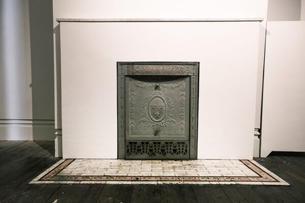 Another interesting and uncommon feature of this room is the fireplace. A rare find with it’s original steel plate intact, seeing as most fireplaces from this period were melted down to build weapons and munitions during WWII. Ashes from past fires remain contained within, a discovery I once made after accidentally bumping the back plate from its hold. A projector hangs from the middle of the room surrounded by a crown molding medallion that has been moved onto the ceiling from a place that once held a light fixture.