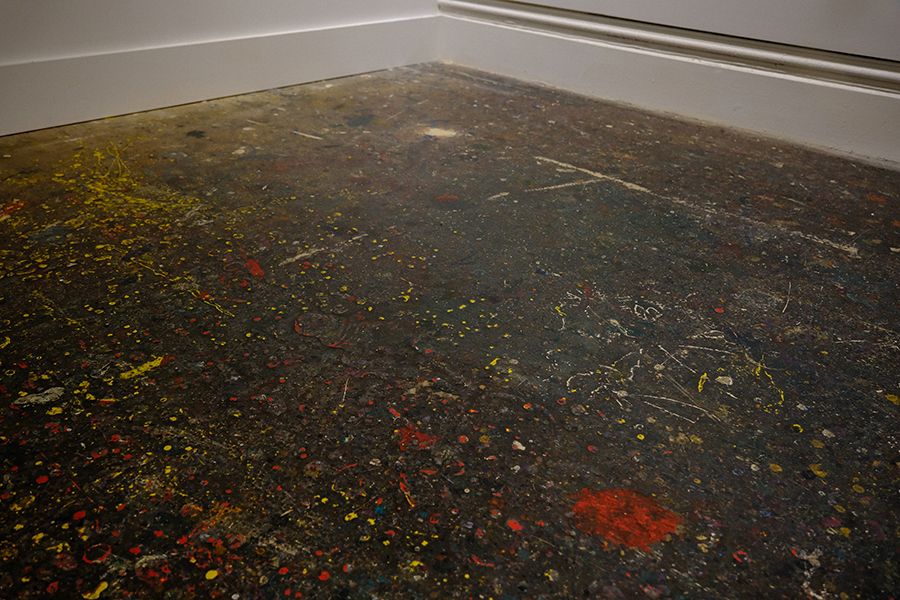 On the outside of the room’s window a gold leaf advertisement reading “Accordions- P. Grueb” stands in for the prior owner. During Greub’s time, this room was actually two. It bares the bones of Ireland’s previous studio practice with paint splattered on the ancient linoleum flooring. A break in the material of the floor points to the past division of this space. In the open room, Greub had one corner for his shop, where customers would enter, and another for his work of repairing accordions. Customers would enter the side door on Twentieth Street to conduct their business, much like visitors to the house do now.