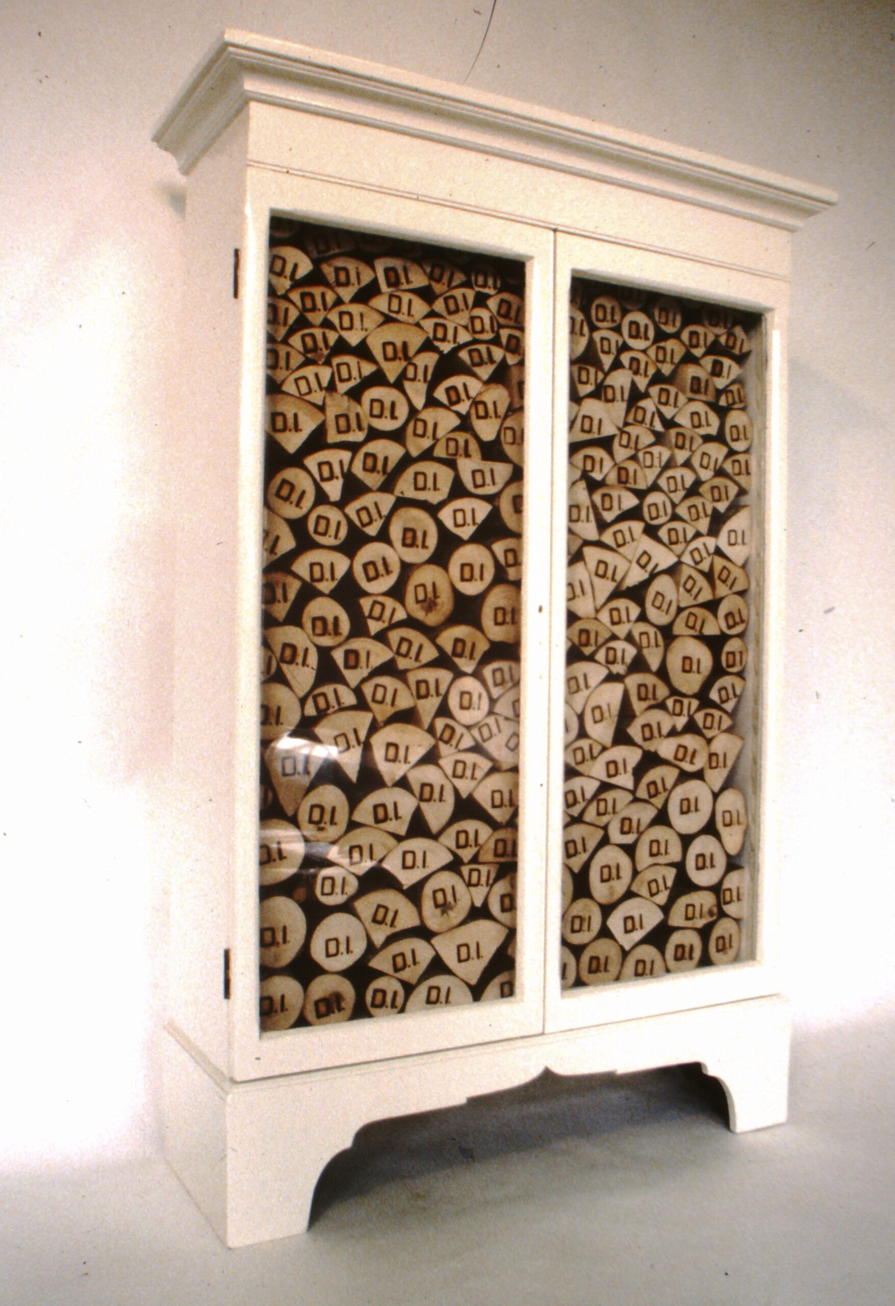 The cabinet became a place to preserve, protect, and elevate the objects it contained. In a typical Ireland vitrine, paintings are placed alongside precarious wire sculptures, clods of dirt, and jars of material like water and sawdust. In his piece Ego, 1992, David stacked pieces of firewood inside a cabinet with his initials “D.I.” branded into them. While playing on the palindromic nature of his initials, Ireland conjures the notion of Id. By putting the logs in a cabinet he implied the protection of his identity.