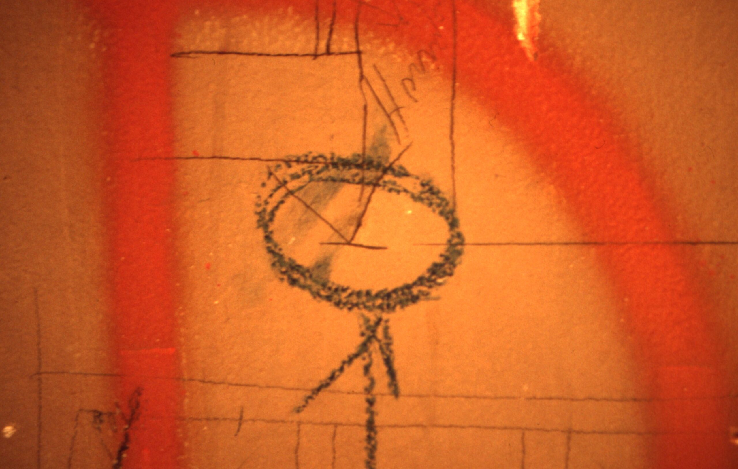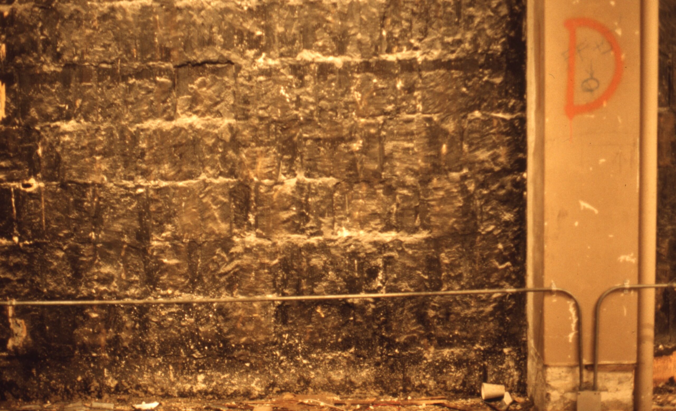 when they were doing renovation work there? What was inside was a very different kind of surprise: The exposed wall was brick seemingly slathered with black tar, with white streaks of lime, with traditional red brick above—through this project we all learned that the building was a mishmash of additions and subtractions. Ireland laid that bare, as did Maria Porges in an irreverent audio tour. But the real surprise was the pale brown concrete pillar with two letters in red spray paint. I,D,I. From one angle it read ID—Freudian or identification-- and from the other, DI, the artist’s initials. Ireland fumed at the coincidence. It was too perfect, almost cutesy in its cosmic whimsy. He had a real, unwitting connection to the building. He called the piece Disclosure.