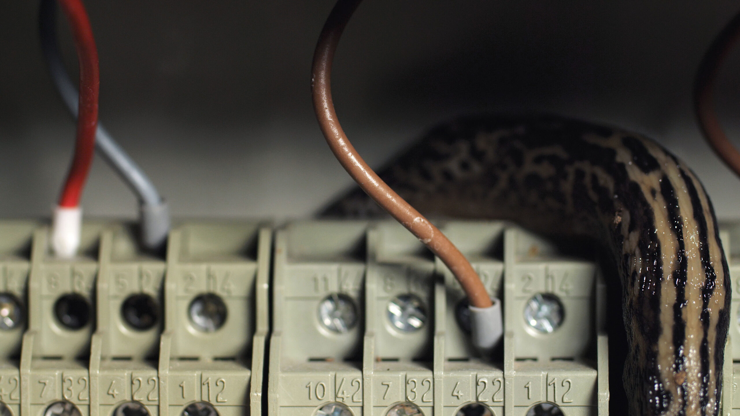 Drag-Out draws significant attention to the infrastructure of our built environment and its relationship to natural material creep. At the center of the exhibition is Energy Budget, (Nina Canell & Robin Watkins, 2017-18): a two-part video that juxtaposes a slow-moving leopard slug on an electrical switchboard, with a series of large passages that have been built into housing complexes at Telegraph Bay, Hong Kong.