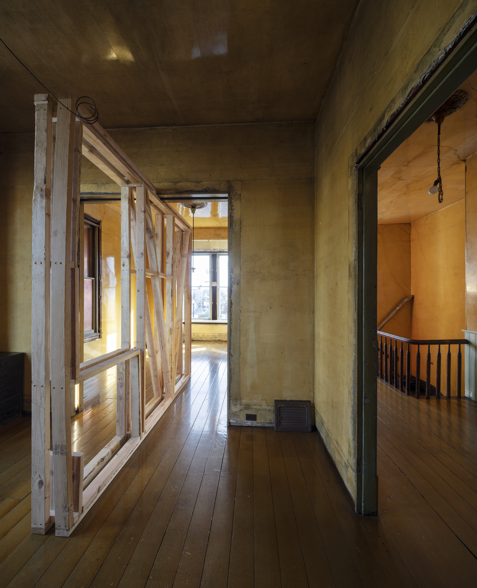 In one work, Rio opens up the floorboards to reveal a hidden stairwell and extends it, with copper pipes. Rio also finds inspiration in Ireland’s basement, in the network of pipes and electrical conduit, and merges this with an artwork that Ireland made by recording the sound of the pipes and walls. Rio’s sculptural sound installation transmits and amplifies vibrational sound within the House– “I see these items–webs of ABS, PVC, unistrut, wood, soil and conduit–as the veins that bring lifeblood to the house, preserving its ability to function–a need that preceded Ireland and continues into the future,” writes Rio.
