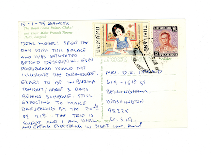 Researching the provenance of Ireland’s Buddha statue was the first step in formulating the reason as to why this object came into his collection and what special significance it held for him. The second step was looking through the archive and reading his letters and postcards to friends and family back home. Although a definite point of origin cannot be determined at this time, I am left wondering if this statue is from Myanmar, and possibly, from around the location of the ancient kingdom of Bagan. In the letter to his mother, Ireland wrote that he “spent 2 days there crawling through temples and climbing to the tops of some to look out over the Irrawaddy.”13 On this trip in 1975 Ireland visited India, Singapore, Thailand, Myanmar (Burma), and Afghanistan, yet it is only Myanmar that he writes about extensively in the letters to his mother and friend.14 It is evident through these correspondence, that even though Ireland traveled multiple times to Thailand and only once to Myanmar, it was ultimately Myanmar that captivated his heart.15